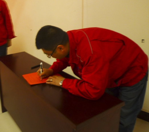 動(dòng)員大會(huì)上各級(jí)領(lǐng)導(dǎo)、各車(chē)間管理干部、車(chē)間班組長(zhǎng)上臺(tái)進(jìn)行“百日安全大練兵”活動(dòng)簽字儀式。